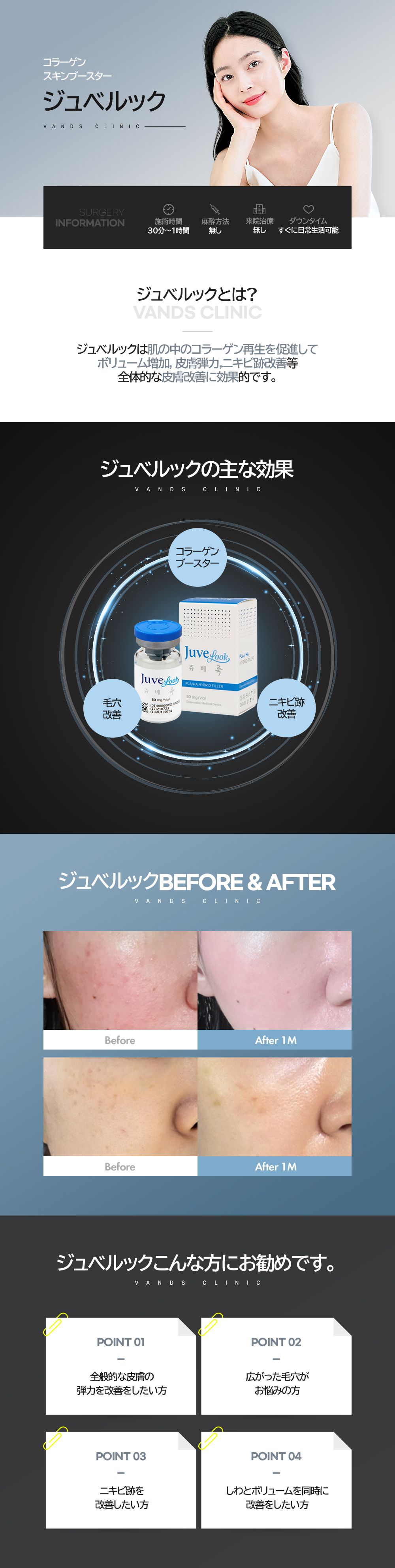 ジュベルックは高分子PLAと人体皮膚組織に存在するヒアルロン酸を結合させた自己組織再生型のコラーゲンブースターです。 肌に注入された後、すぐにボリューム効果が現れる他のフィラーとは異なり、自己コラーゲン生成を促進し自然なボリュームを作ります。 また肌のハリや小じわ、キメの改善にも効果があります。